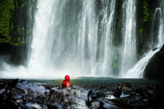 A hooded lady stairs down the waterfall of Gunung Rinjani