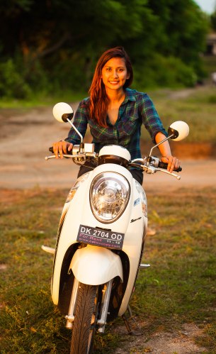 Riding a moped under the sunset.